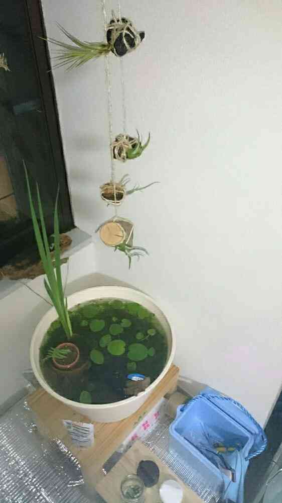 なぜかチランジアが増えました(笑)100均のだけど(^_^;)チランジアの為と睡蓮鉢の温度が上がりすぎないように小さな扇風機があったので設置してみました\(^o^)/