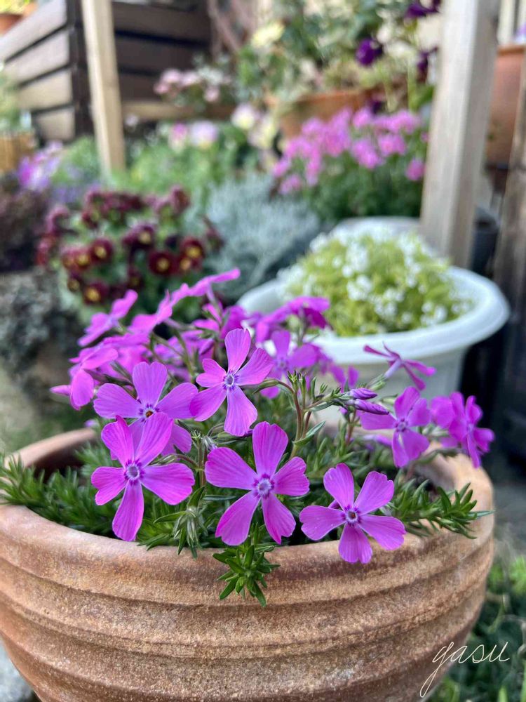 鉢植えの芝桜も風情がありますね。植木鉢がいい引き立て役になってますよね。✨