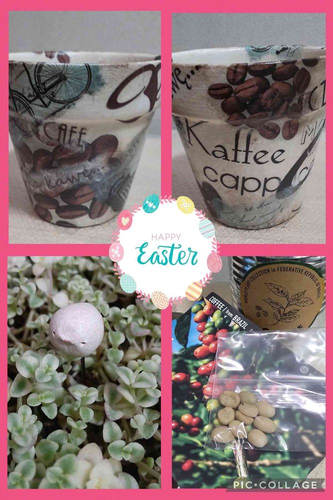 一斉プレ企画で頂いた「まなさん」の、リメ鉢。さっきの投稿ではリトルミッシーで、絵がはっきり見えてなかったんですが、実は、珈琲豆が💕