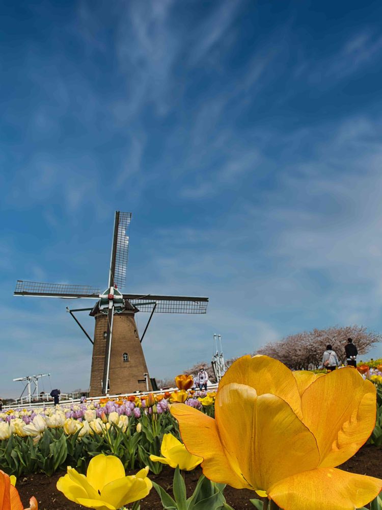 開催2日目なので、まだ🌷蕾の列とかありした。風車裏の🌼植物や横の🌸さくらが綺麗✨でした👍