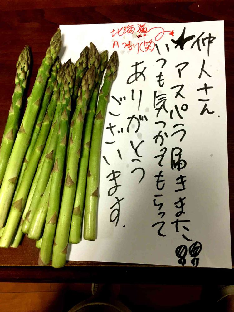 大変な時に、新鮮なアスパラ有難うございます。今日でも電話しますね〜♪