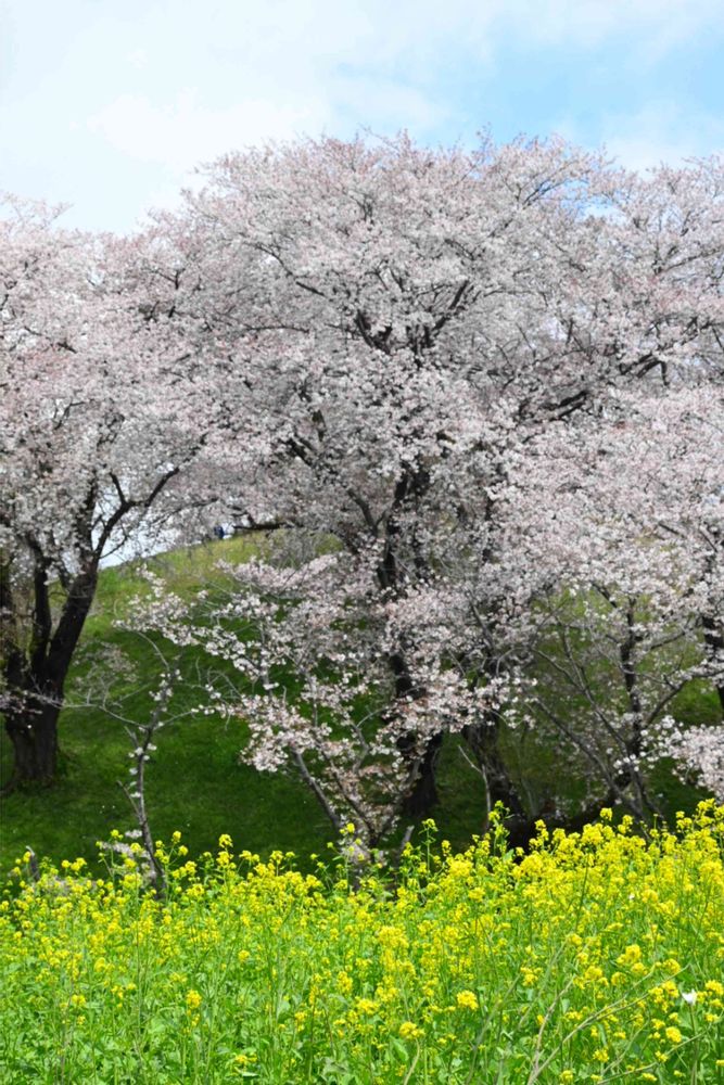 手前に満開の菜の花、前方後円墳にソメイヨシノ…美しいです🌸🌿😊