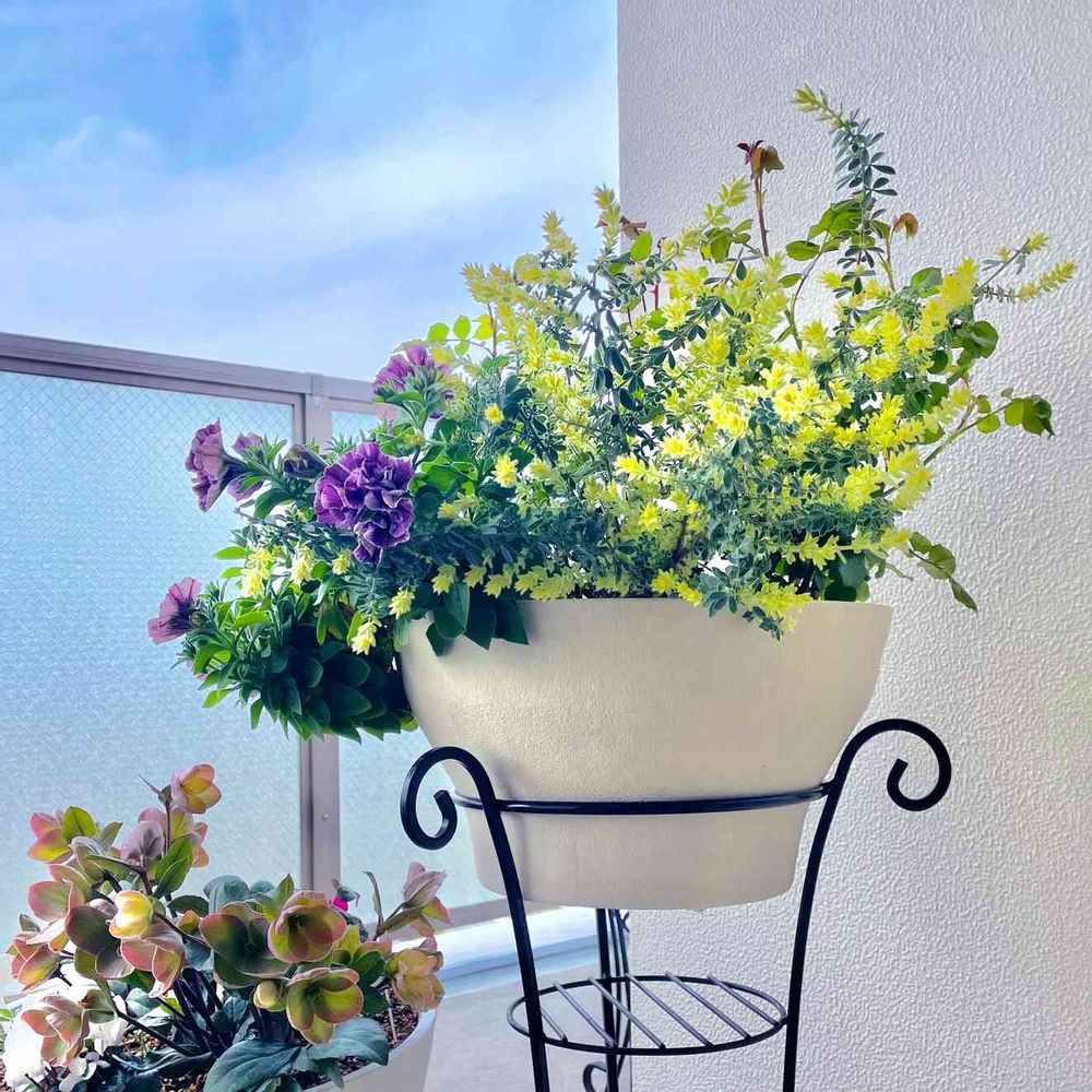 寄せ植えを作る時は、皆さん成長時の姿を想像しながら組み合わせされると思いますが、ここに置くプランターは、斜め後ろを部屋からも眺めるようになるので、後方も楽しめるように作りました。
