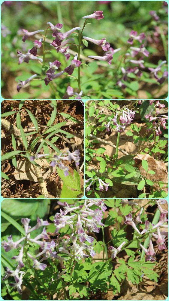 ミチノクエンゴサク(陸奥延胡索)ケシ科キケマン属の多年草。"春の妖精 spring ephemeral スプリング・エフェメラル"です。花の長さは1cm程です。⬆️ は苞葉の切れ込みの比較用。⬅️➡️⬇️ 茎葉の比較用です。