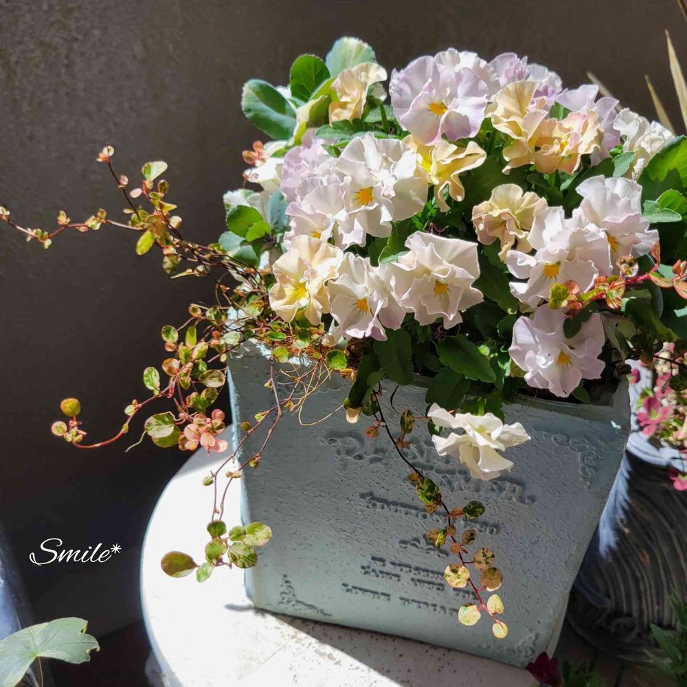 ブック鉢に寄せ植えしたヌーベルヴァーグアンジュ🌿🌸🌸🌿よく咲いてくれました🎶