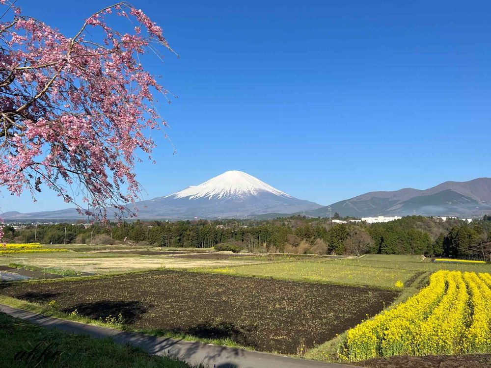晴天に桜と菜の花が輝いて、富士山を盛り上げているようです❣