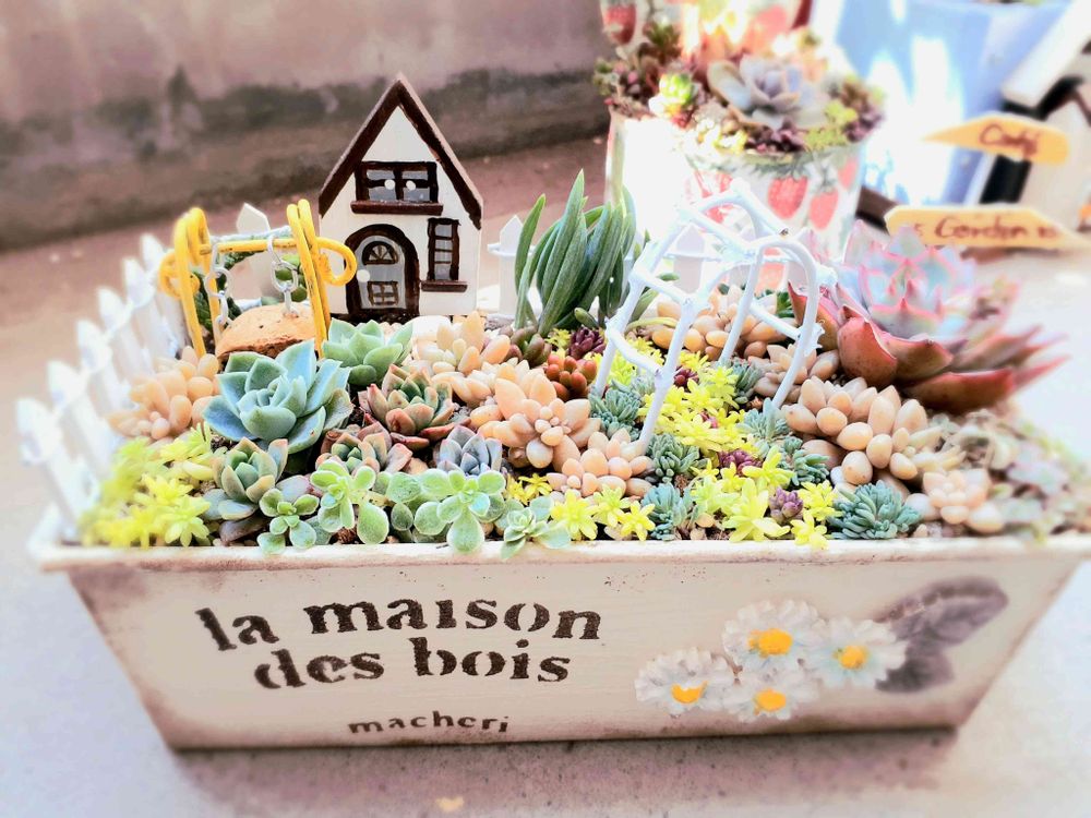 リメ缶も春らしくて、寄せ植え箱庭にぴったりね🌸🌸