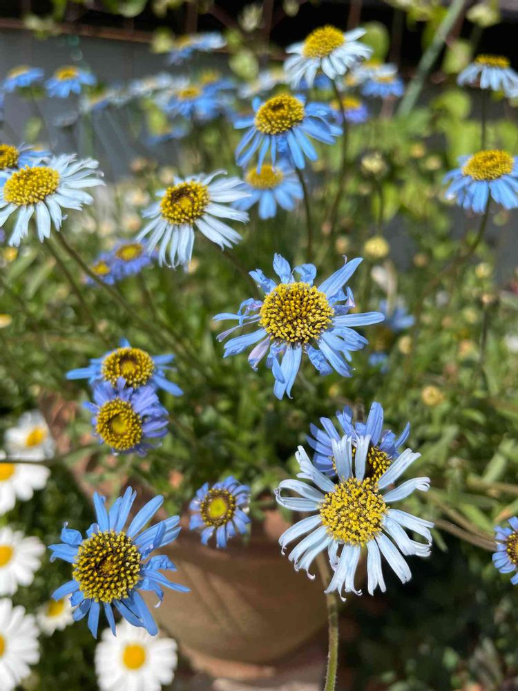 お花の色、濃いのと淡いブルーがあるのかな、、、ちりちりのデージーさん可愛いですね💙💙