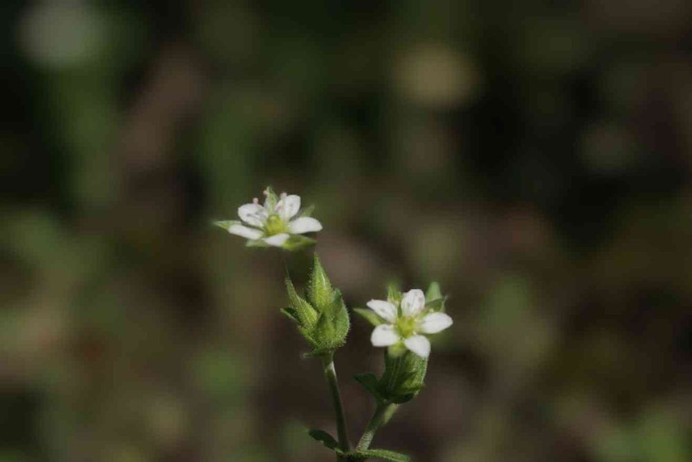 ノミノツヅリと似た花の爪草(ツメクサ)は花と萼片は同じくらいの長さ。
