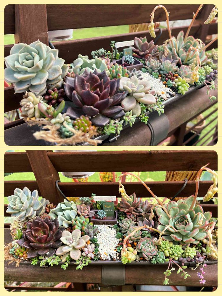 私も先日、リベンジで、雨樋プランター頂いて、箱庭作りました。大きいので、結構大変じゃなかったですか❓反響凄くて、今日は、セダムを追加してました‼️もう少しで、完成です。まだ置き場所というか、吊り場所が決まらないので、下に置いています😅