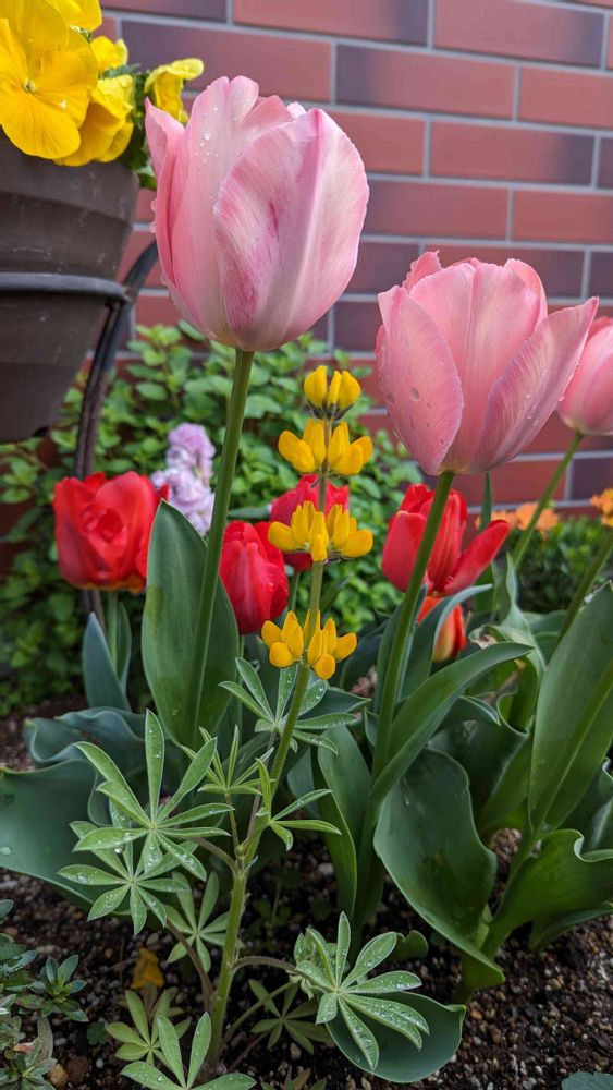 チューリップの間に種から育てたルピナス開花😊