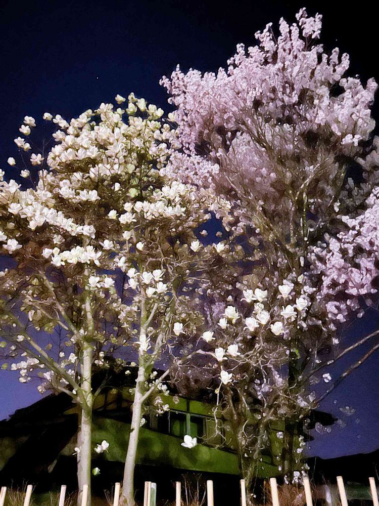毎日の通勤路に、木蓮と桜の花が満開に近く街灯に照らされて美しい姿で帰り道を照らしてくれました🌸
