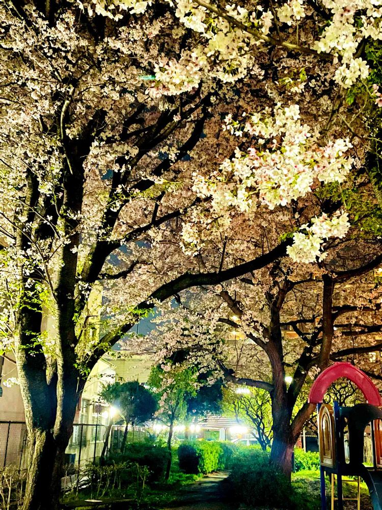 風が吹くと、花びらチラチラと落ちてきて、夜は幻想的な美しさ˚✧₊⁎🌸⁺˳✧༚