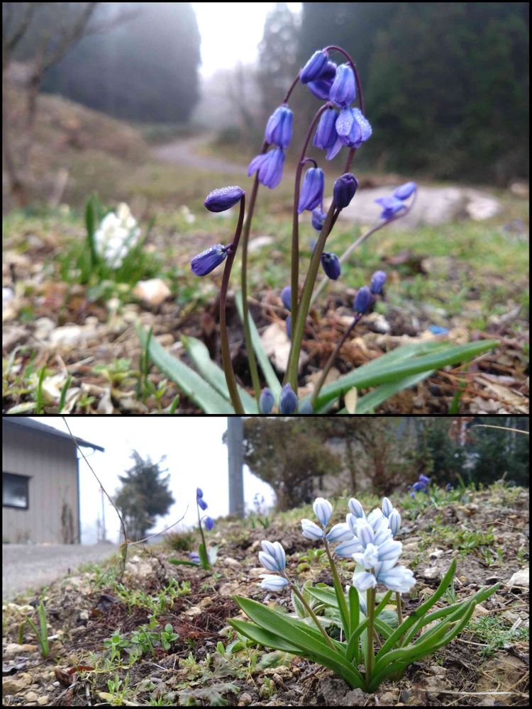 お借りしてる空き地の花壇の青いシラーとストライプのプスキニアが咲いています💙🤍