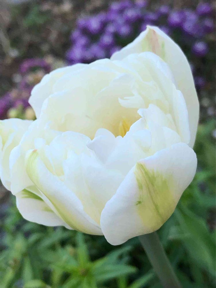 咲くまでどんなお花か知りませんでしたが、ちょっとグリーンがかった八重のチューリップでした。大人っぽい。