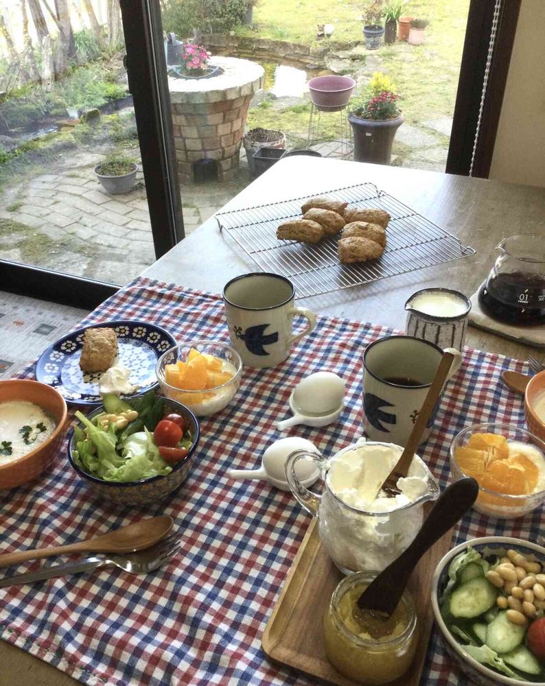 何とオサレな朝食‼️全粒粉のスコーンとかゴボウとマシュルームのスープとか‼️ホテルですか〜