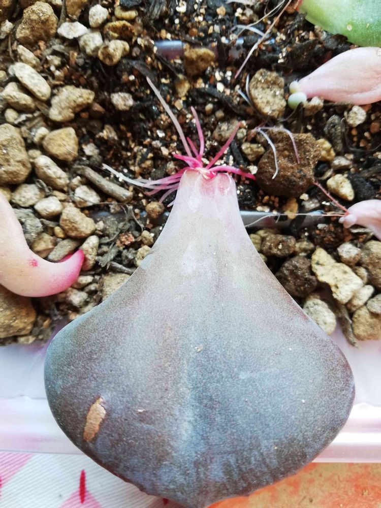 ダスティーローズの葉が植え替えのときに落ちたので、葉挿しトレーに置いといた。ちょー大きな葉なんだけど、出てきた根が立派すぎてキモッ😱って思った…