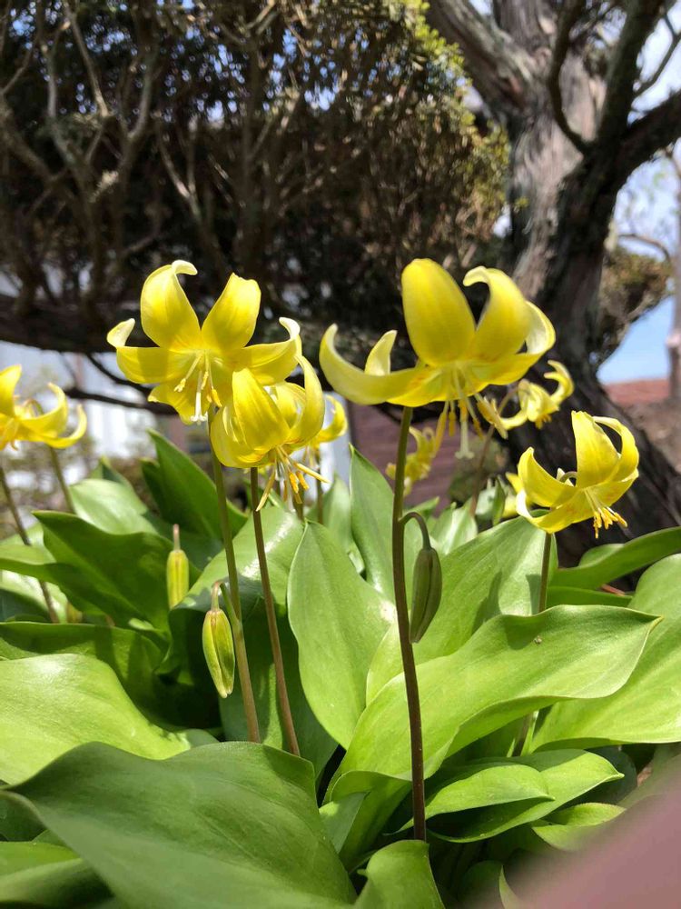 知人の庭に黄色のカタクリが見ごろを迎えていた。😊👍🎶📸
