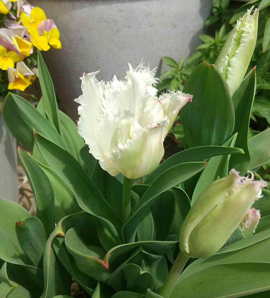 サカタのタネの何て名前か忘れましたが、白とピンクのフリンジの花びらの球根🌷植えて、ようやく咲きました🌷
