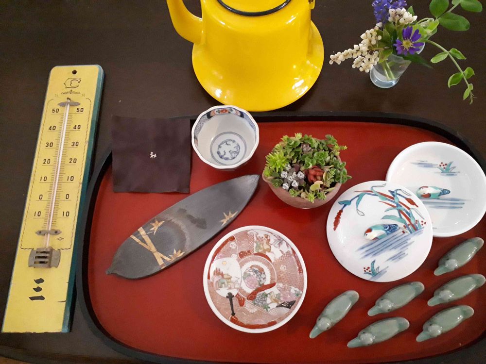 ご近所さんが骨董品を毎回出店されているので。真ん中の多肉は御自分で窯で器を焼いて多肉ちゃんを育てられています。