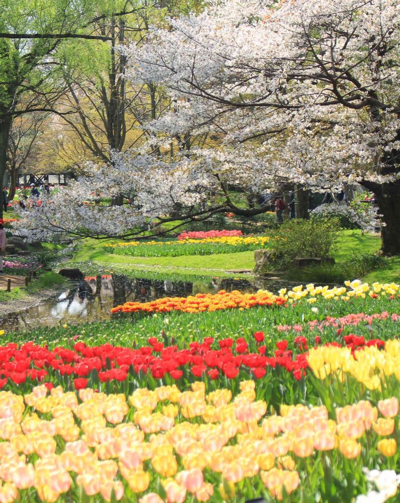 美しいチューリップとソメイヨシノの共演は、昭和記念公園ならではですね。