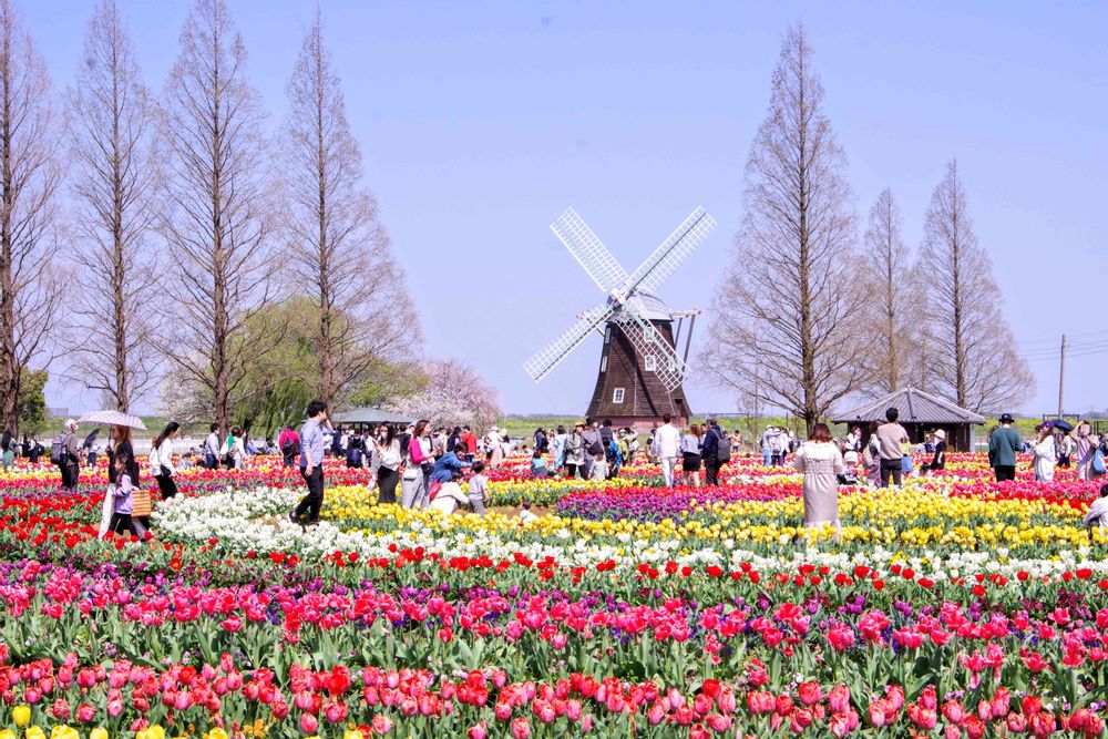 広いひろいエリアに、色とりどりのチューリップが咲き乱れ、遠くには風車がゆったりとした姿を魅せています