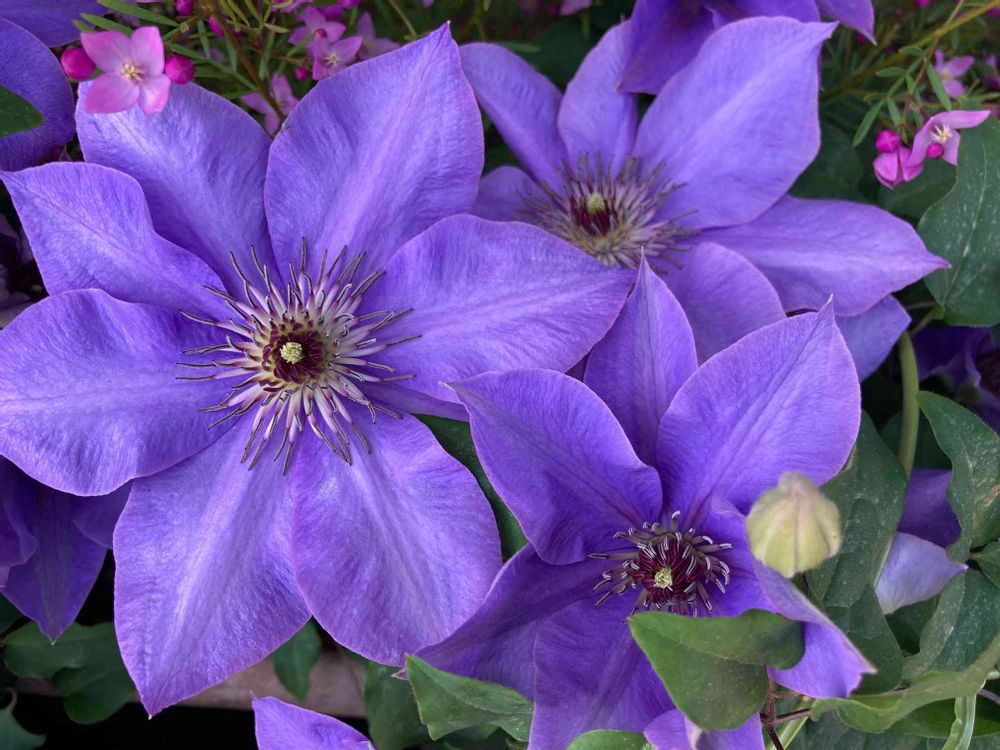 大輪のクレマチスを引き立てる小さなピンクの花はボロニアでしょうか🧐