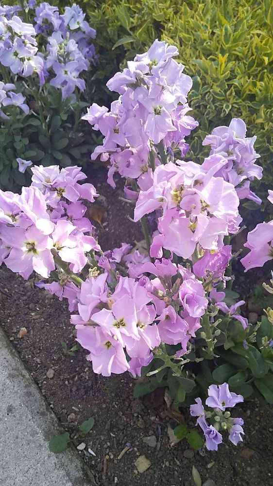 🚶🏻♀️💟🚶🏻♀️💜💮🚶🏻♀️🌱道端の花壇に…やさしい一重咲きのストックの花…