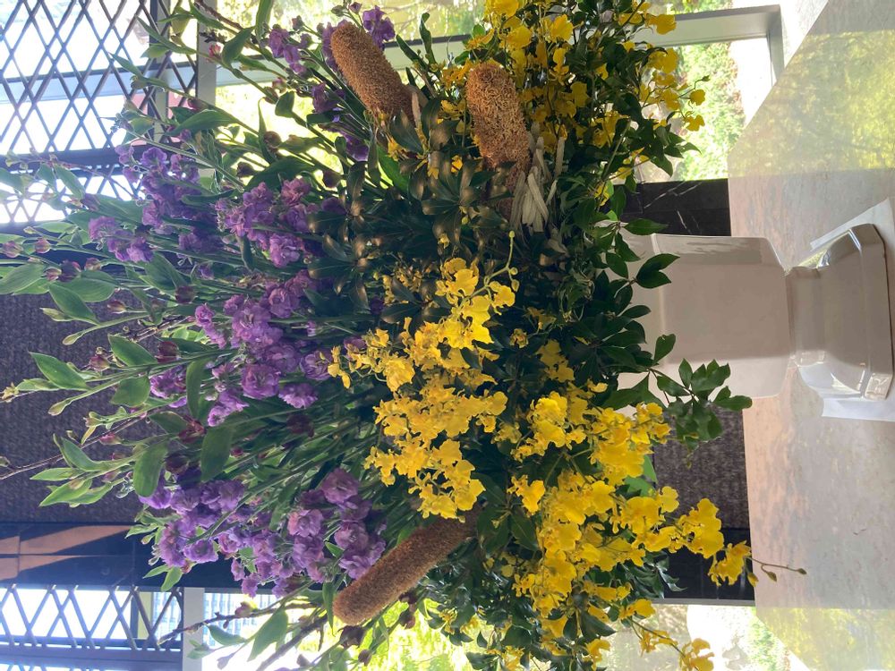 こんばんは😊コンビニへの花道🌼🌸春が進むにつれて、花の色や種類も変化しますね👍😃🎶バンクシアは何度かアクセントに。毎週、ありがとう😊