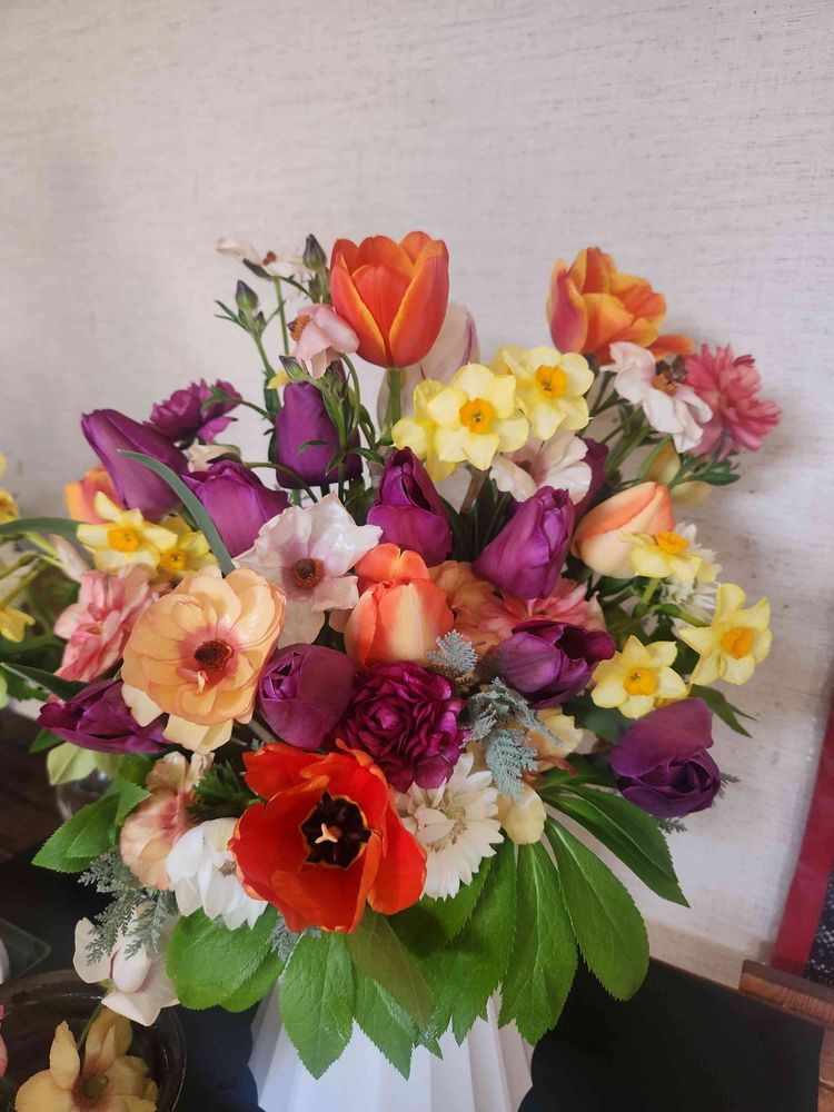 紫チューリップを、ベースになんて思っていたら、やっぱり、色が欲しくなり、オレンジいれてー