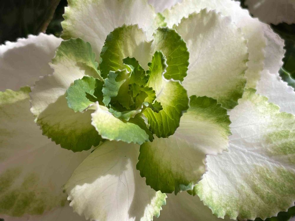 寄せ植えの葉牡丹の茎が伸びて様子の変化と同時に葉が美しく感じてパチリ。