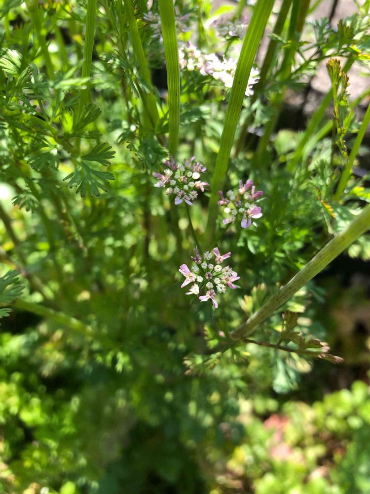 食べる葉っぱから、するすると茎を伸ばすと、すごく細い繊細な葉っぱがでてて、花が咲いてます。