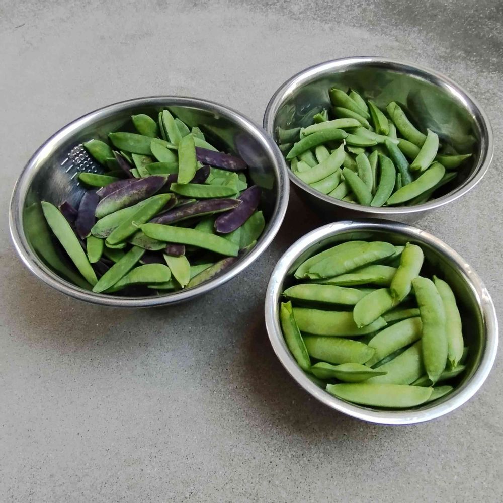 豆とっておいてと言われ収穫しましたが、グリーンピ-スをスナップエンドウと勘違いしてたくさんとってしまった。