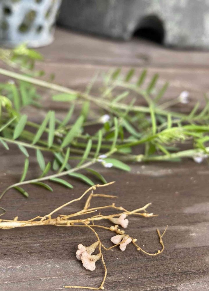 マメ科の根っこにくっついてる根粒菌が土を肥やしてくれるとあって、スズメノエンドウに一役かってもらいました