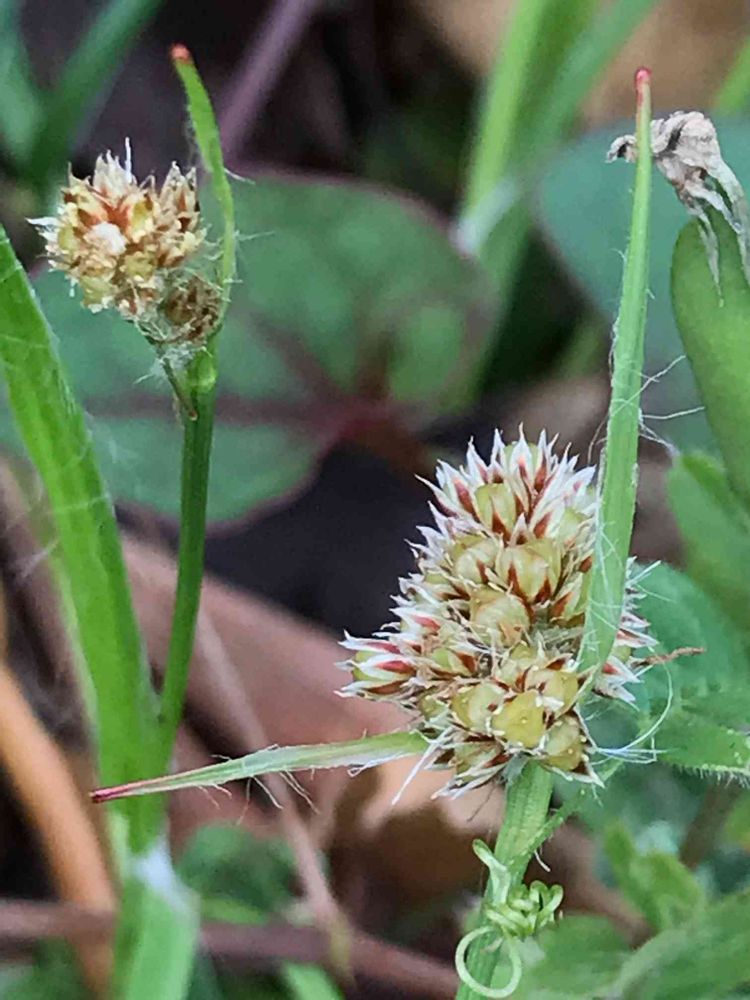 外出先。植え込みの一角。スズメノヤリに巻き付いているのはカラスノエンドウの巻きヒゲです。