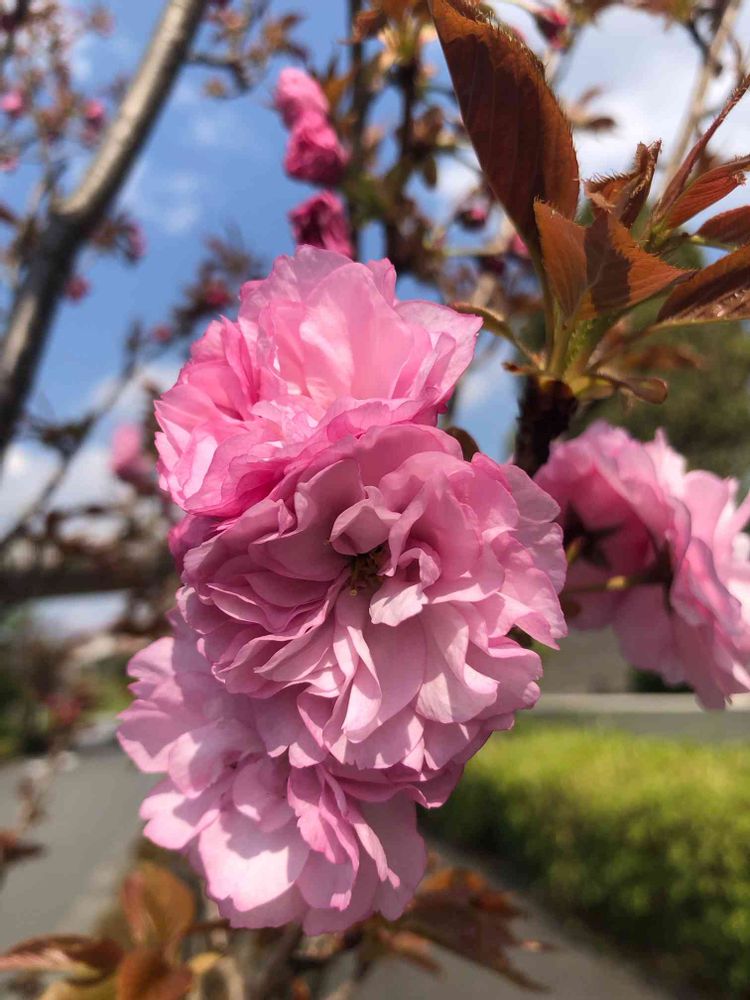 パート先への通勤で通る道の、歩道と車道の境目に植えられている八重桜です。