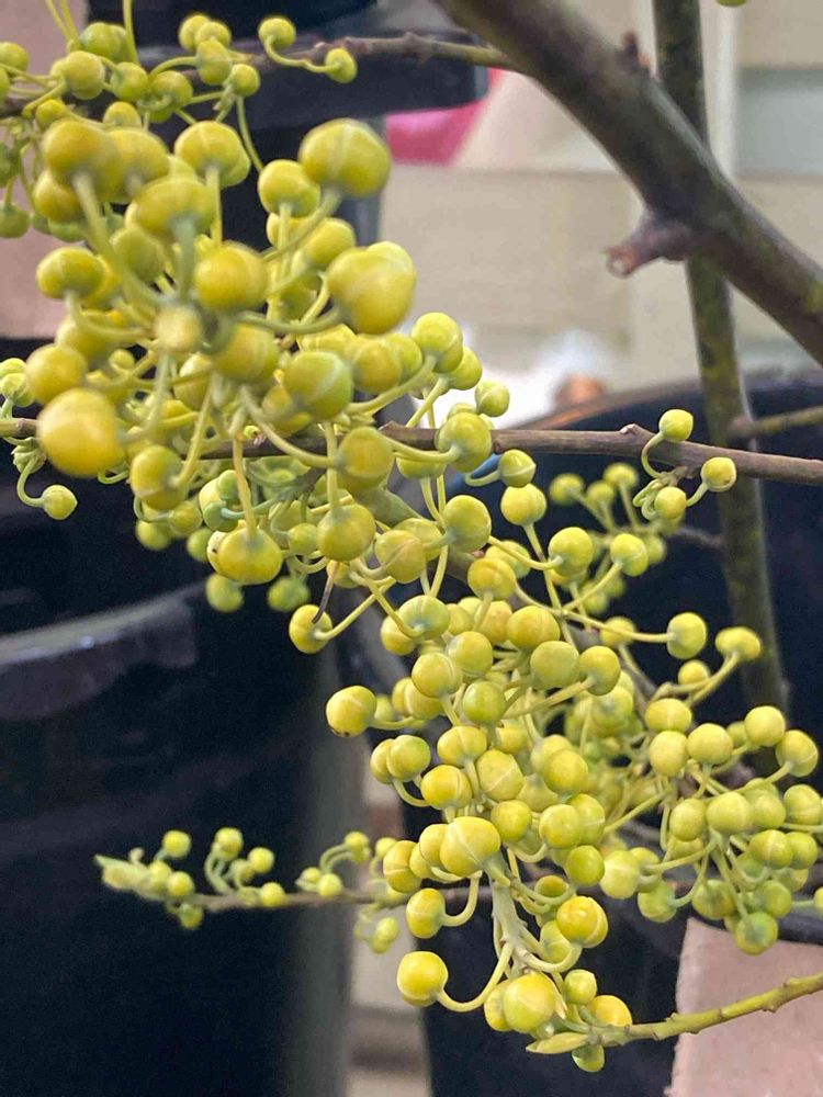 枝一面に鈴なりに小さな緑色の粒々のつぼみをつける😊