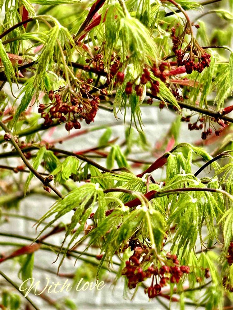 <春風に揺れて>冬越しにみんなを守ってくれた我が家のもみじさんも‥ようやく清々しい新葉と沢山のお花を見せてくれてます♡また冬はみんなを守ってくれる存在になるのでしょうね(#^.^#)