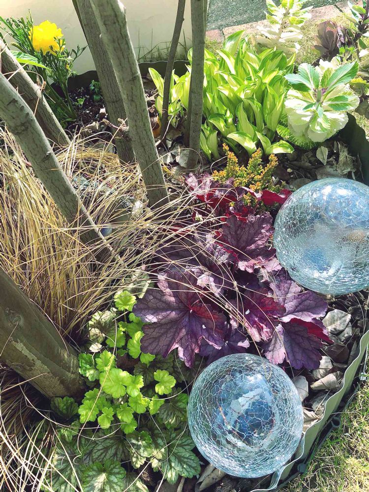 メインガーデンのシンボルツリーの株元 ギホウシが出てきました♡ ヒューケラドルチェフローズンマスカットも新しい葉が綺麗です♪