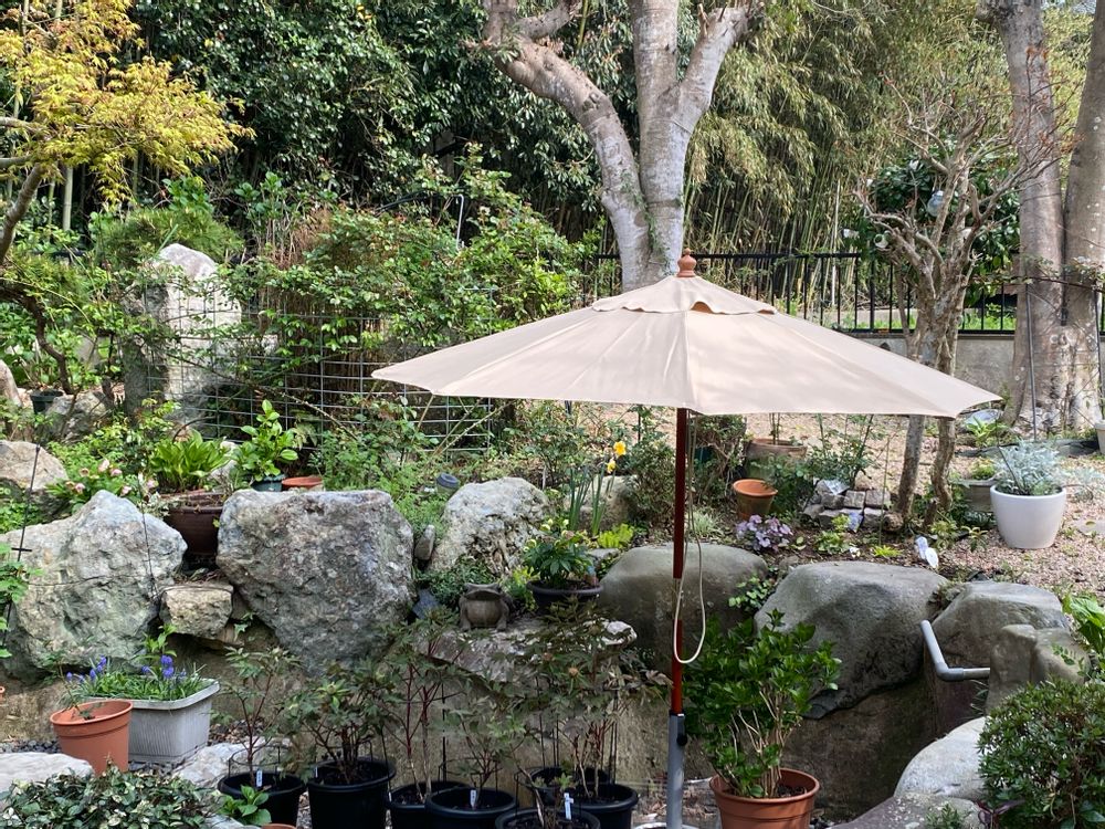 右上に見える白い陶器鉢と同じものの中央に他のパラソルの土台を置き、池に敷いている砂利を詰めて固定してみました😊