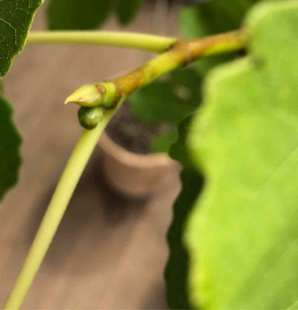 小さい新芽の下にポチッとまるいものが!👀 イチジクかなぁ♬