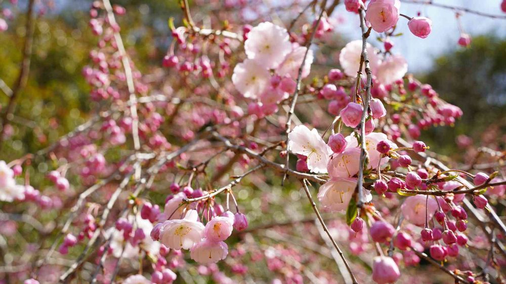 エドヒガン系の園芸種、花は八重咲きで色は淡紅色、細く柔らかい枝が下に垂れています😊