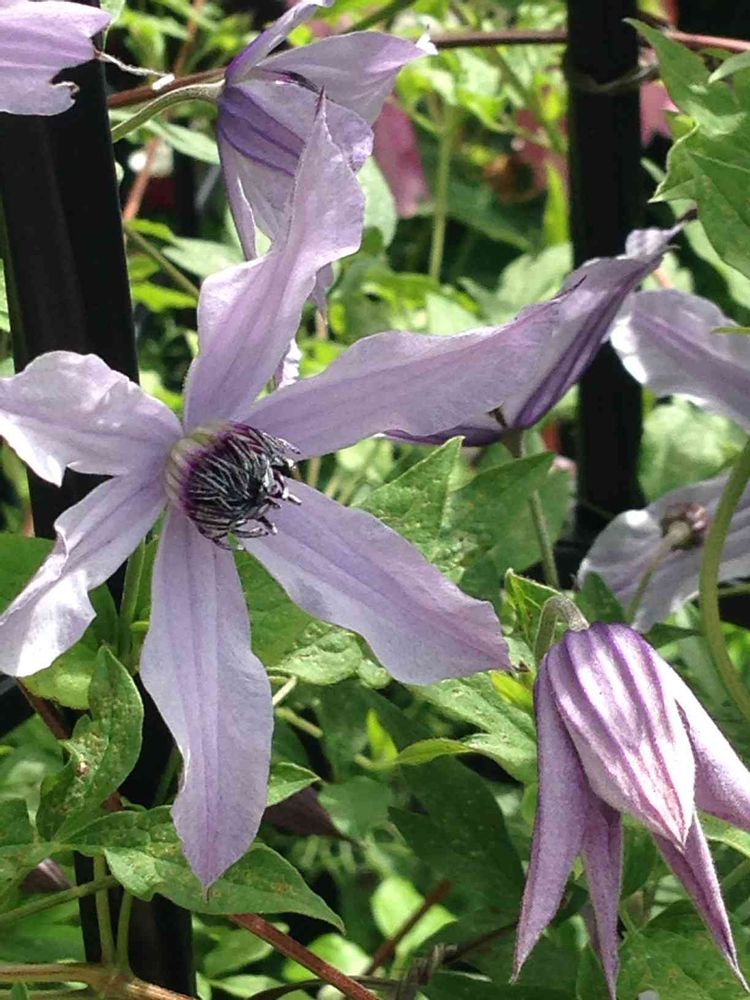 去年の秋に植え付けたクレマチス 流星。シルバーラベンダーの花色が爽やか。中輪で多花性です。他の花と馴染みます。