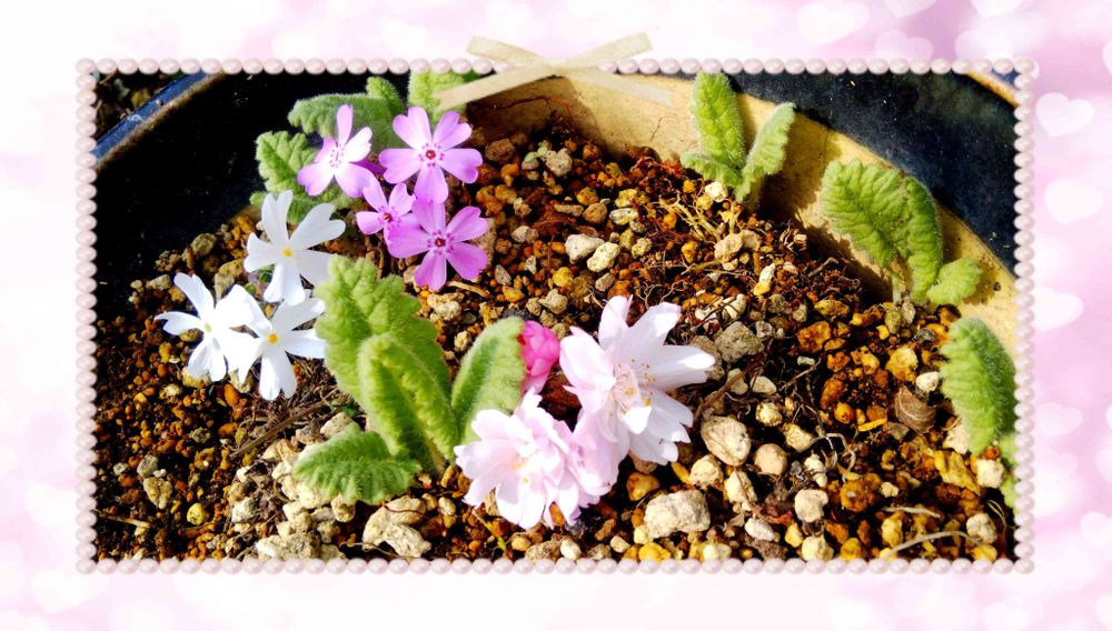 我が家の鉢植え🌱⋆。葉が出たばかり、八重桜と芝桜❀.*・゚添えました(^-^;