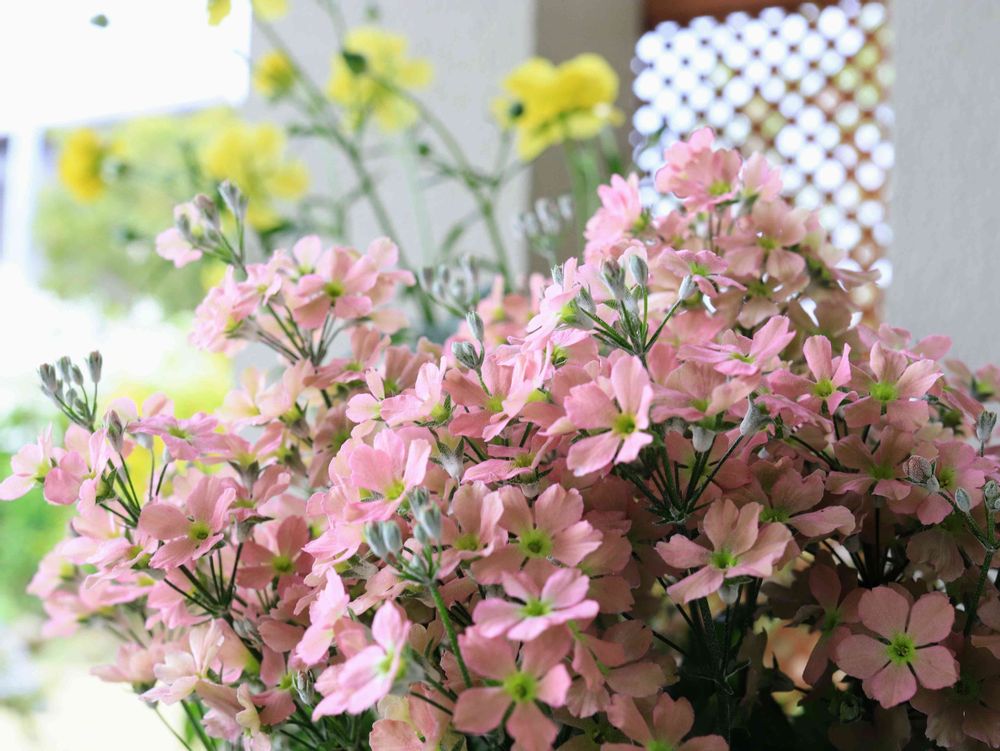 ほんの少しピン色の花弁にライムイエローが混じってきました👀