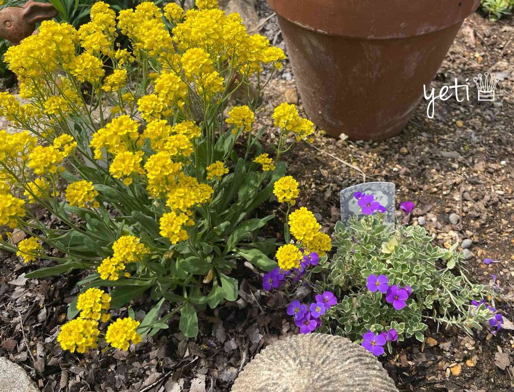 アリッサム サミットとオーブリエチア バリエガータ♪オーブリエチアはかわいい😍と一目惚れして植えてみましたが、夏に極端に弱いとの悲しい情報が。一年草扱いだとか。かわいいのにな〜🫤