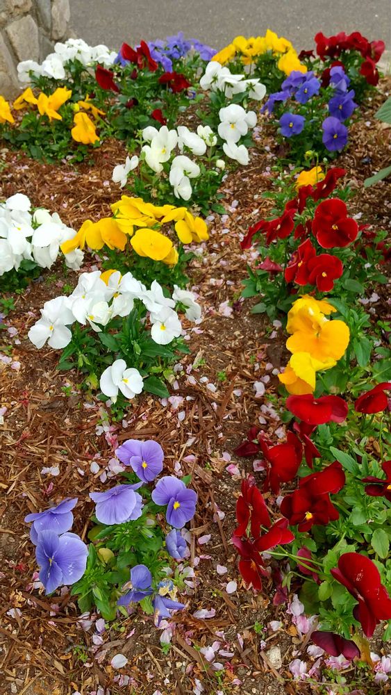 赤、黄色、紫色、白いパンジーの花が綺麗です。