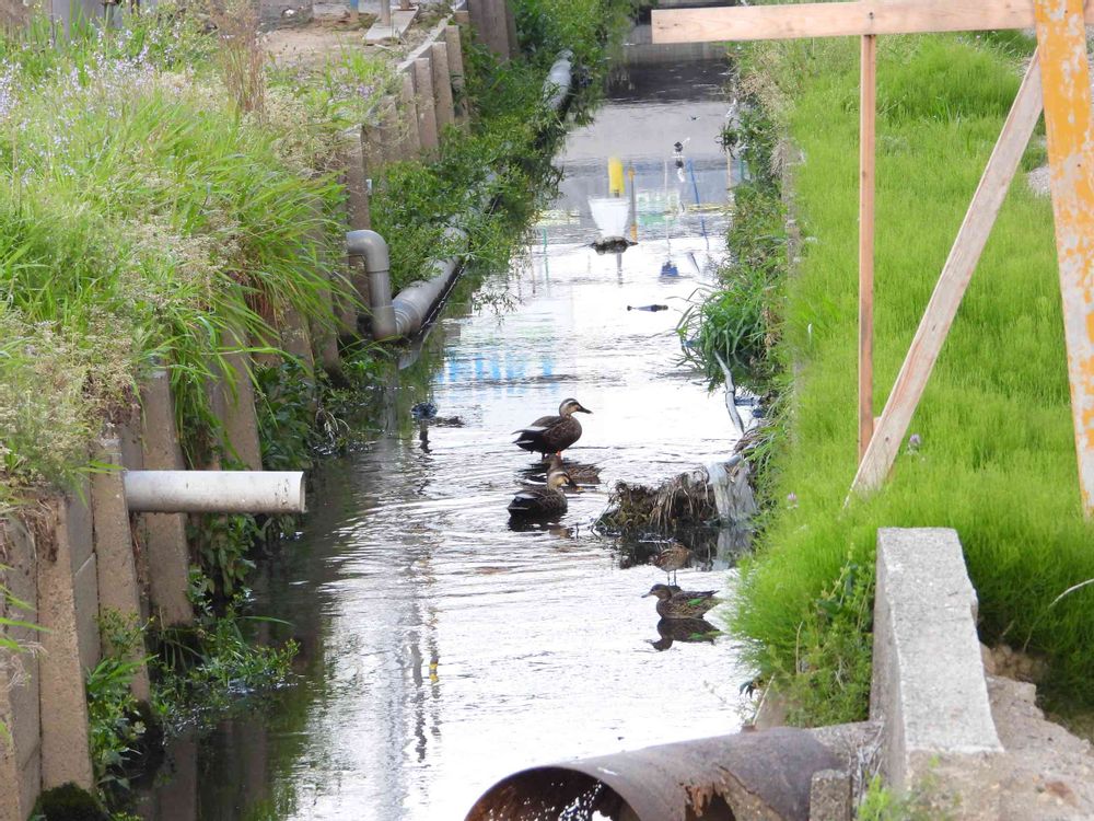 温泉♨️のお湯が流れてくる用水にタシギやカルガモ やコガモが集まっていた。