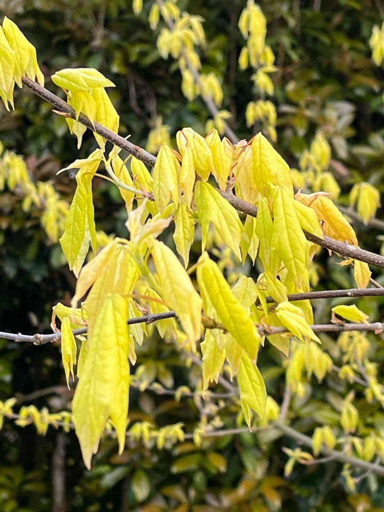トウカエデ 花散る里✨昨年に引き続き新芽の白〜薄いピンクをほとんど見る事なく黄色い葉っぱが展開し始めました💛💛昨年はいきなり黄緑色の新芽だったので💚🌿少しはましかな?