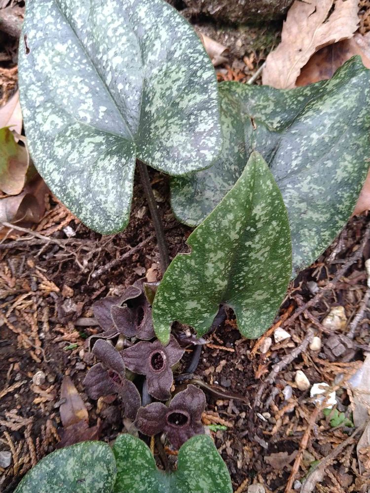 木曽川北側には丸い葉のヒメカンアオイ、南側東海丘陵には大葉で斑入りのカンアオイが 2023.4.5 八曽自然休養林